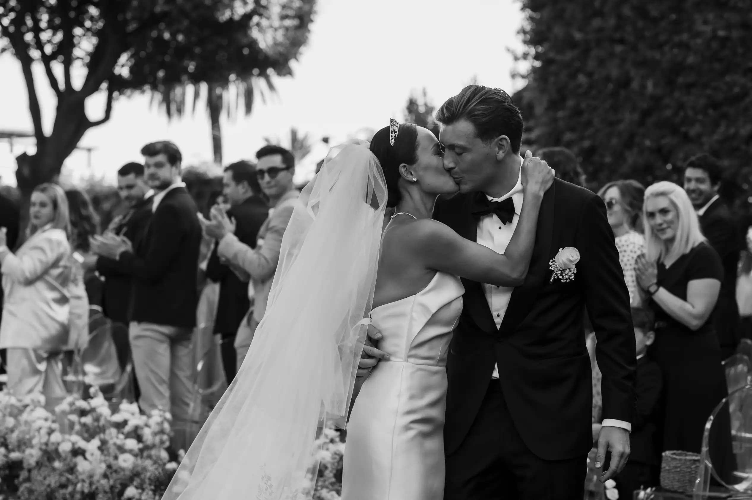 Dinner was set in the villa’s spectacular Lemon Garden, where two long imperial tables adorned with white florals and candlelight faced the villa, creating a setting of understated elegance. Between speeches and laughter, the couple shared a heartfelt thank-you to the team who made their dream day possible.