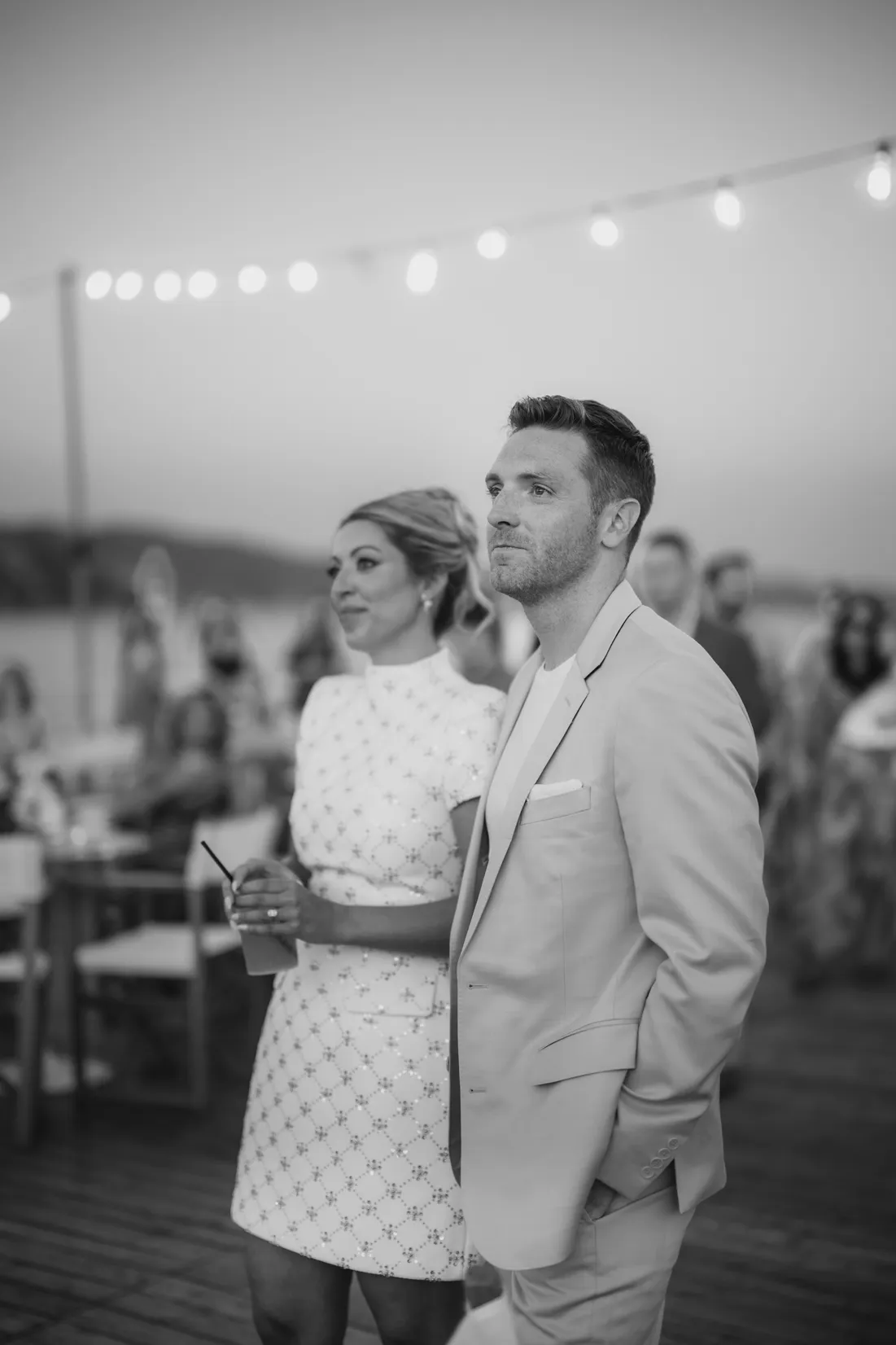 Ally and Patrick’s welcome party unfolded at the exclusive seaside club Bagni Sirena in Portofino. The iconic orange-and-white palette of the beach infused the evening with a lively, joyful spirit that echoed through every detail of the décor.